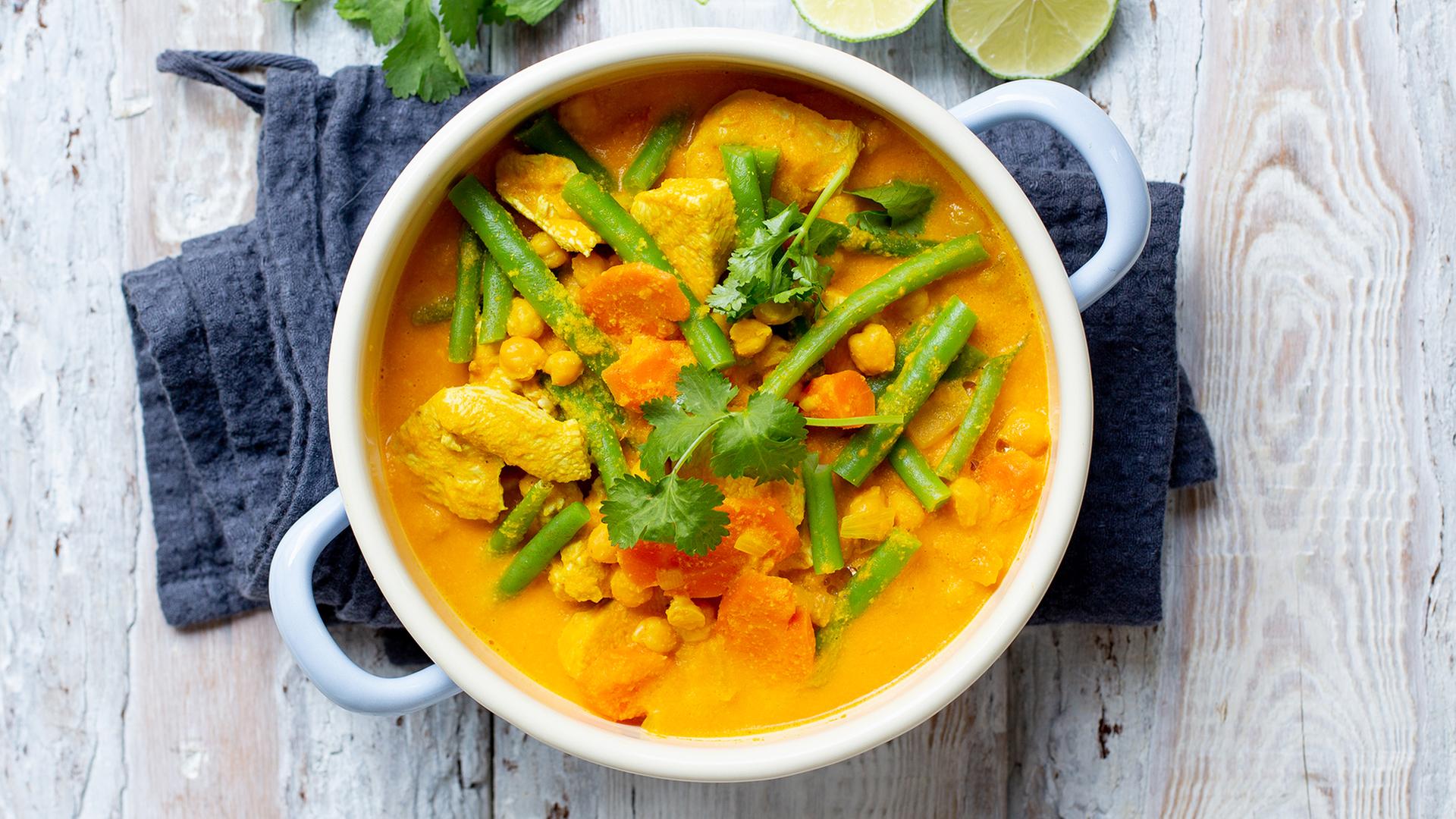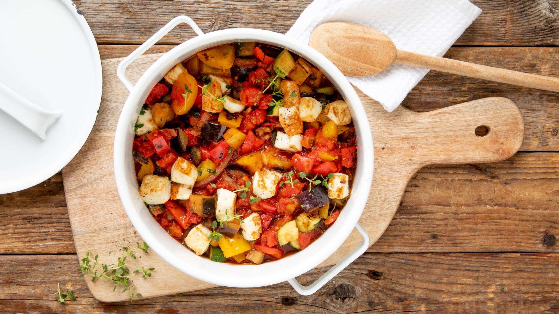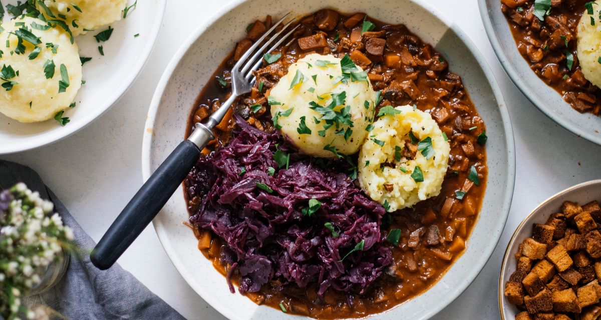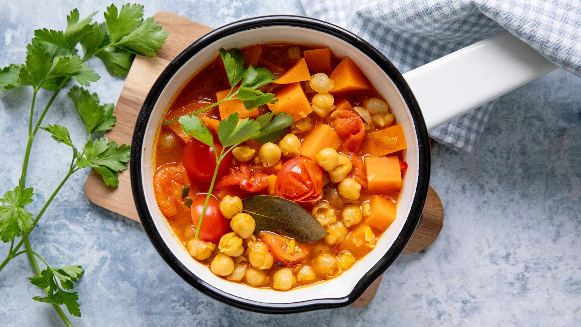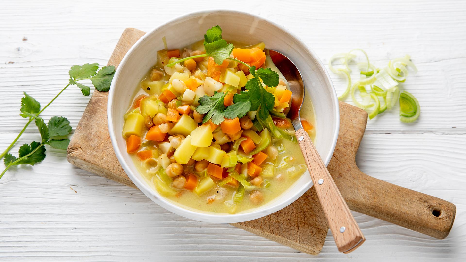 Lasse den Eintopf aufkochen, stelle den Herd auf mittlere Stufe und lasse die Kartoffeln etwa 10 Minuten köcheln.