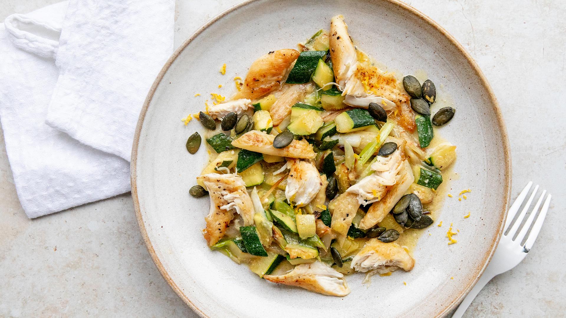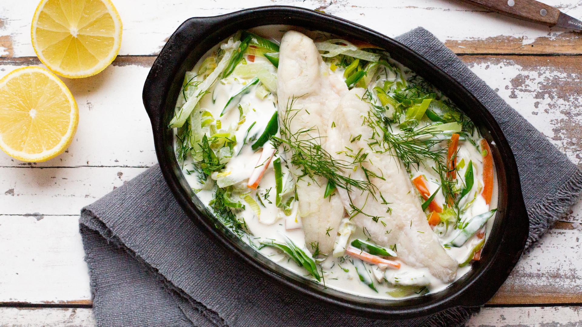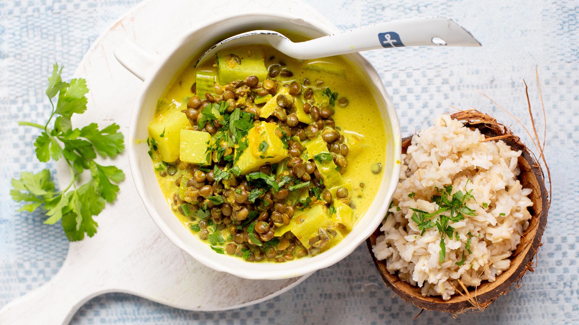 Schäle die Kartoffeln und schneide sie in grobe Stücke. Gib sie mit in den Topf und füge das Wasser, die Gewürze und den Zitronensaft hinzu.