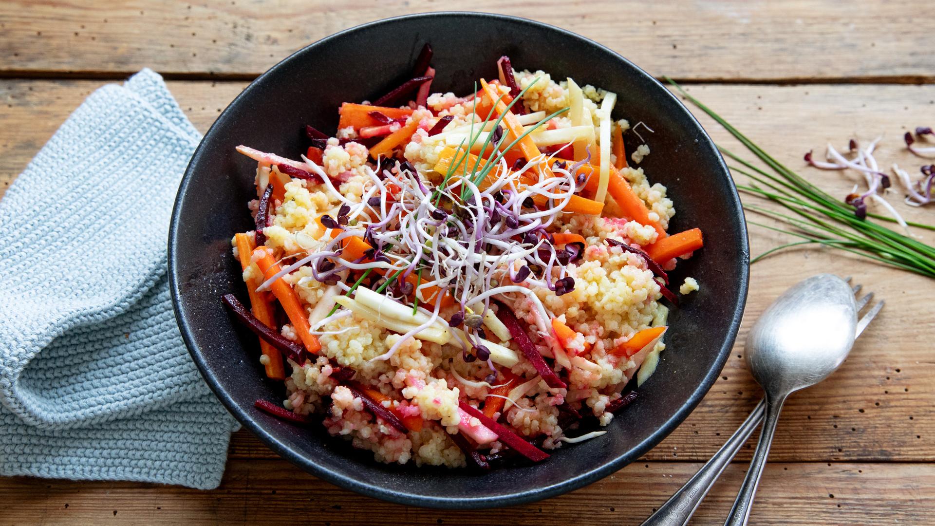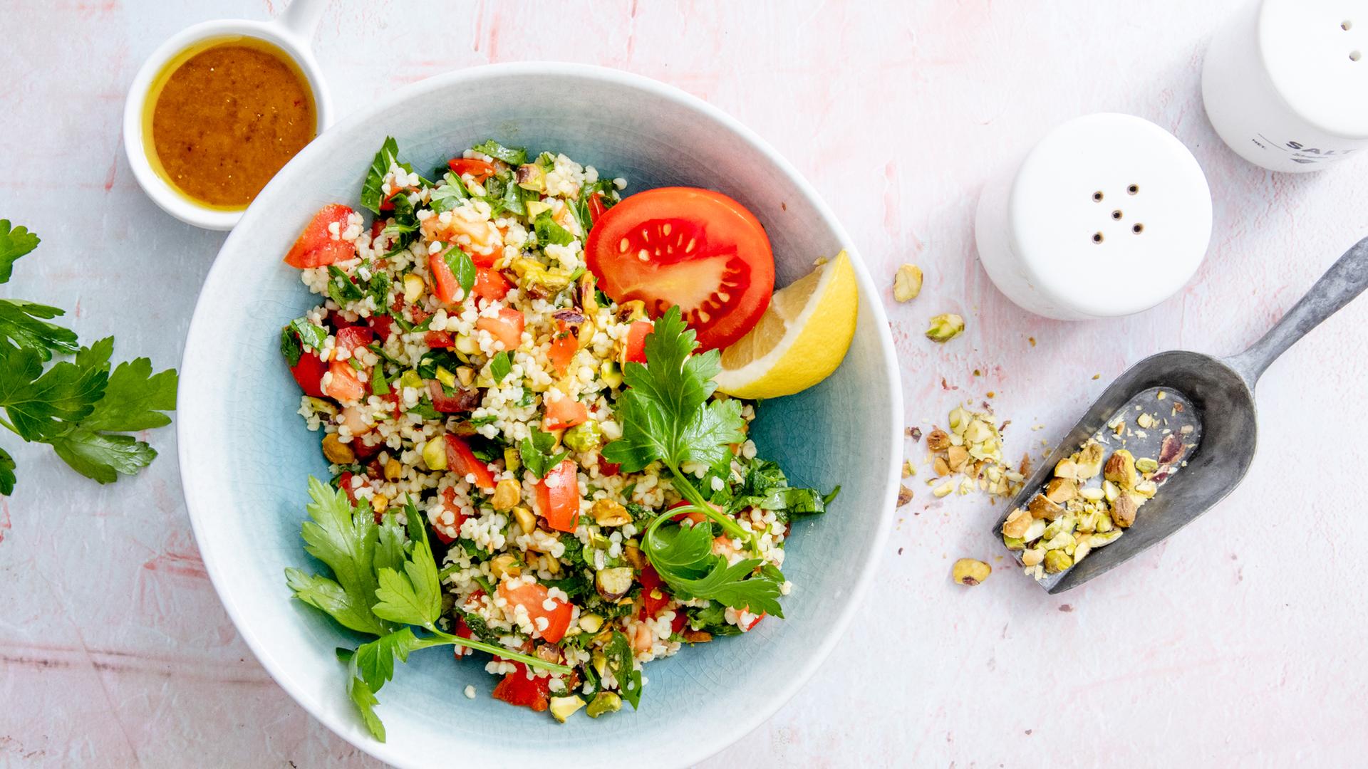 Gib das Rinderhackfleisch mit dem Bulgur in eine große Rührschüssel, presse die Knoblauchzehe dazu und füge die Gewürze hinzu.